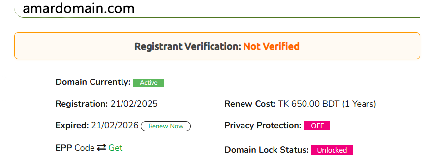 আপনার ডোমেইন যদি এরকম দেখায় তাহলে বুঝতে হবে আপনার ডোমেইনটি রেজিস্ট্রেন্ট ভেরিফাই করা নেই